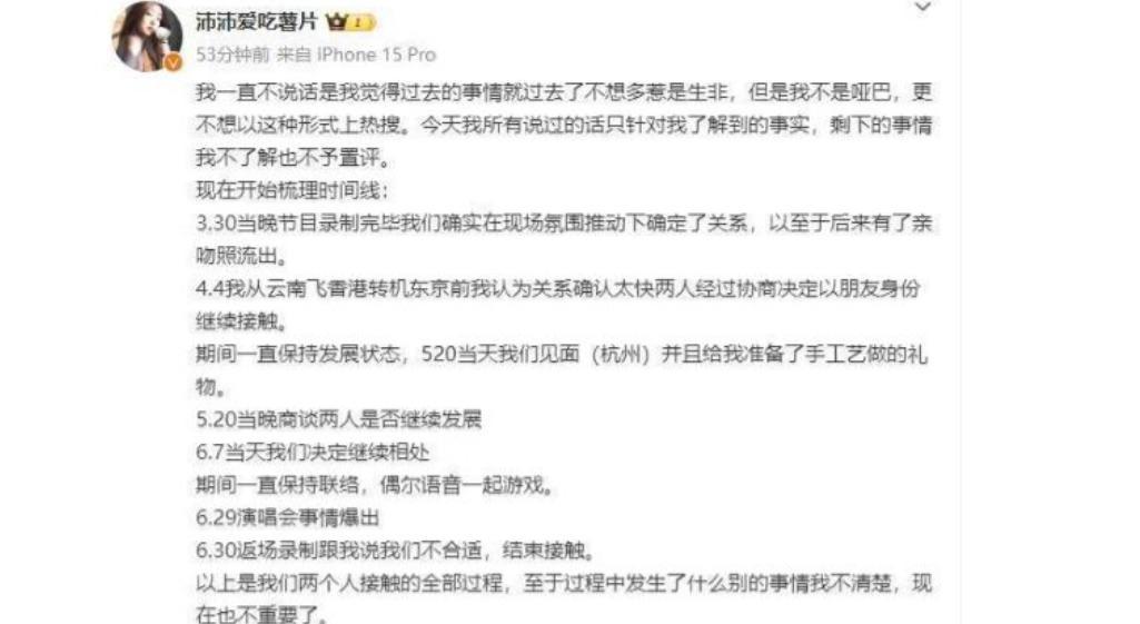 接着,滕在恋综的暧昧对象沛沛发了长文列明了两个人发展的时间线。